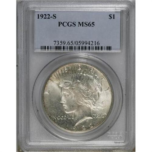 <B>1922-S $1 MS65 PCGS.</B></I> A strong striking impression is evident on both sides, and the back edge of Liberty's neck is doubled. Vibrant satiny luster illuminates the nicely preserved surfaces, which are toning-free on the reverse and show a slight degree of mottled, milky patina on the obverse. An alluring Gem from the second year of the Peace dollar series. <BR><BR><B>Coin Engraver:</B> Anthony de Francisci<BR><BR><b>Shipping:</b> Coins & Currency (<a target="_blank" href="http://www.heritageauctions.com/common/shipping.php">view shipping information</a>)