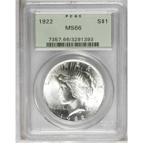 <B>1922<img border='0' src='http://www.heritagecoins.com/images/star.gif' width=10 height=10>$1> MS66 PCGS.</B></I> An exceptional example of this issue that gives the impression of conservative grading. Boldly struck for this issue and highly lustrous with wisps of golden patina. Housed in a green label holder.