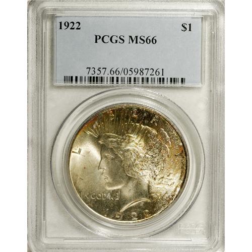 <B>1922 S$1 MS66 PCGS.</B></I> Delicate peach, lemon-gold, and pale blue patina appears on each side of this highly lustrous Premium Gem. Suitably struck with only small, isolated marks.<BR><BR><b>Shipping:</b> Coins & Currency (<a target="_blank" href="http://www.heritageauctions.com/common/shipping.php">view shipping information</a>)
