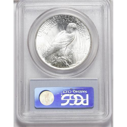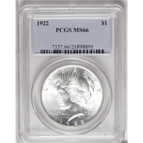 <B>1922<img border='0' src='http://www.heritagecoins.com/images/star.gif' width=10 height=10>$1> MS66 PCGS.</B></I> Generally well struck except for the commonly seen weakness on the eagle's leg feathers, with exceedingly bright, frosty luster and untoned silver-white surfaces. A thick die crack extends across the base of Liberty's bust, and a few small milky spots, along with a few scattered abrasions, are noted on the reverse. A lovely Premium Gem, despite these minor defects.