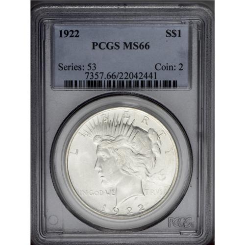 <B>1922<img border='0' src='http://www.heritagecoins.com/images/star.gif' width=10 height=10>$1> MS66 PCGS.</B></I> The portrait and fields are gorgeously preserved. A brilliant premium Gem that has blazing luster and an imposing strike on the major devices. The borders have a hint of softness of detail. An impressive type coin, and a suitable addition to a quality Registry Set. <BR><BR><B>Important notice:</B> Heritage usually auctions material at the rate of 200-250 lots per hour. On some occasions eBay Live bid software or the Internet may not be able to keep up with the pace of the auction. We recommend placing a realistic absentee bid now as insurance to avoid disappointment. Occasionally the auctioneer may eliminate or reject an eBay Live bid, and the auctioneer may also reopen a lot after the close of the eBay live bidding (usually because we missed an audience bid), and may reject your bid even if it shows you as the winning bidder. By bidding via eBay Live, you agree that Heritage may award the lot to another bidder at its sole discretion under the circumstances described above or any other reasonable circumstances. Since eBay bids are not shown to us until we open the lot on the floor, we treat those bids just like floor bids. In most cases the floor responds before the eBay bid is presented to us, due to Internet lag time, so for consistency we have made it a policy that floor bids are always considered first over tie eBay live bids. Also please note that all Heritage lots purchased through eBay Live carry a 20% Buyer's Premium. Please make sure you read the Terms and Conditions before you bid. This lot is being auctioned in conjunction with a live floor auction by Heritage Galleries & Auctioneers. All final auction and invoice information will be supplied by Heritage Galleries & Auctioneers, and all other information should be considered preliminary. Lot:3829 <BR><BR><B>Winning Notification and Billing:</B> After the FINAL session in this auction is complete, Heritage will send e-mail and snail mail invoices. This process normally takes several days. All final auction and invoice information will be supplied by Heritage Galleries & Auctioneers, and all other information should be considered preliminary. <BR><BR>This auction will be conducted on a live auction floor and over the Internet through eBay Live. If you choose to place an absentee bid, please take a moment to <font color='#0000ff'><u><a href='http://pages.ebay.com/liveauctions/help/before/laabsentee.html'>learn how eBay Live absentee bidding works</a></u></font><font color='#000000'>