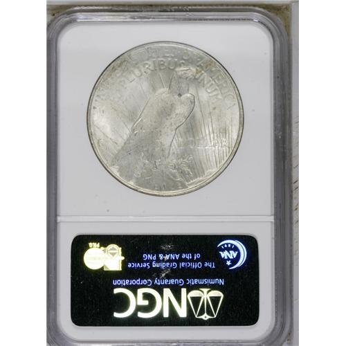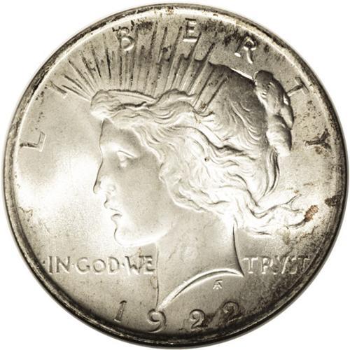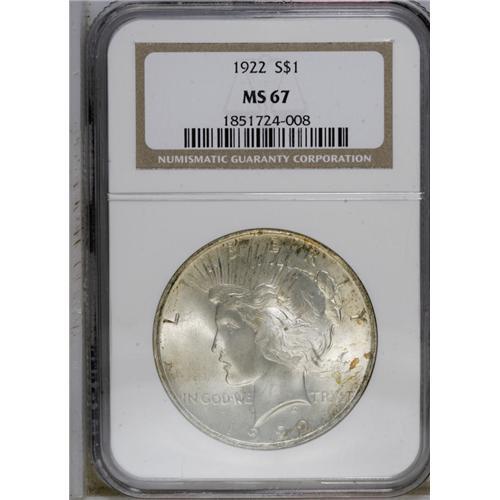 <B>1922<img border='0' src='http://www.heritagecoins.com/images/star.gif' width=10 height=10>$1> MS67 NGC.</B></I> Although the 1922 is the most common date of the series, any Superb Gem Peace Dollar is a rarity. Liberty's cheek and neck, and the open obverse field are targets for incidental abrasions, and many pieces are indifferently struck or have diminished luster. Then there's the present example, which is well struck and has attractive light golden-brown peripheral toning. Intense luster sweeps remarkably smooth fields. Even the portrait shows only the faintest grazes. An unimportant small gray spot rests on the base of the eagle's neck. Census: 6 in 67, 0 finer (9/06).