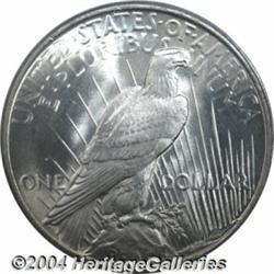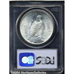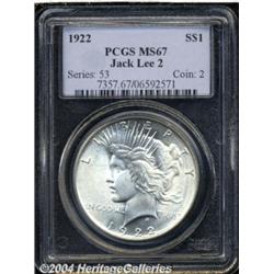 <B>1922<S$1> MS67 PCGS.</B></I> Ex: Jack Lee 2 Collection. While no one is impressed by the rarity of the 1922-P as an issue, everyone will find this piece to be one of the most charming and attractive type coins ever produced of the Peace Dollar design. Mint luster is what characterizes this piece and sets it apart from other high grade coins. It is simply outstanding. Intense mint frost rolls around the nearly flawless surfaces. Brilliant and fully struck--but these are almost afterthoughts on this magnificent coin, a piece that must be seen to be fully appreciated. Population: 19 in 67, 0 finer (7/04).<BR><I>From The Del Rio Collection, Part Two.</B></I> <BR><BR><B>Important notice:</B> Heritage usually auctions material at the rate of 200-250 lots per hour. On some occasions eBay Live bid software or the Internet may not be able to keep up with the pace of the auction. We recommend placing a realistic absentee bid now as insurance to avoid disappointment. Occasionally the auctioneer may eliminate or reject an eBay Live bid, and the auctioneer may also reopen a lot after the close of the eBay live bidding (usually because we missed an audience bid), and may reject your bid even if it shows you as the winning bidder. By bidding via eBay Live, you agree that Heritage may award the lot to another bidder at its sole discretion under the circumstances described above or any other reasonable circumstances. Since eBay bids are not shown to us until we open the lot on the floor, we treat those bids just like floor bids. In most cases the floor responds before the eBay bid is presented to us, due to Internet lag time, so for consistency we have made it a policy that floor bids are always considered first over tie eBay live bids. Also please note that all Heritage lots purchased through eBay Live carry a 20% Buyer's Premium. Please make sure you read the Terms and Conditions before you bid. </span></font></tr></table></td></tr></table>