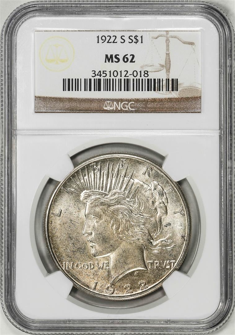 One 1922-S $1 Peace Silver Dollar Coin NGC MS62. NGC Certified.
