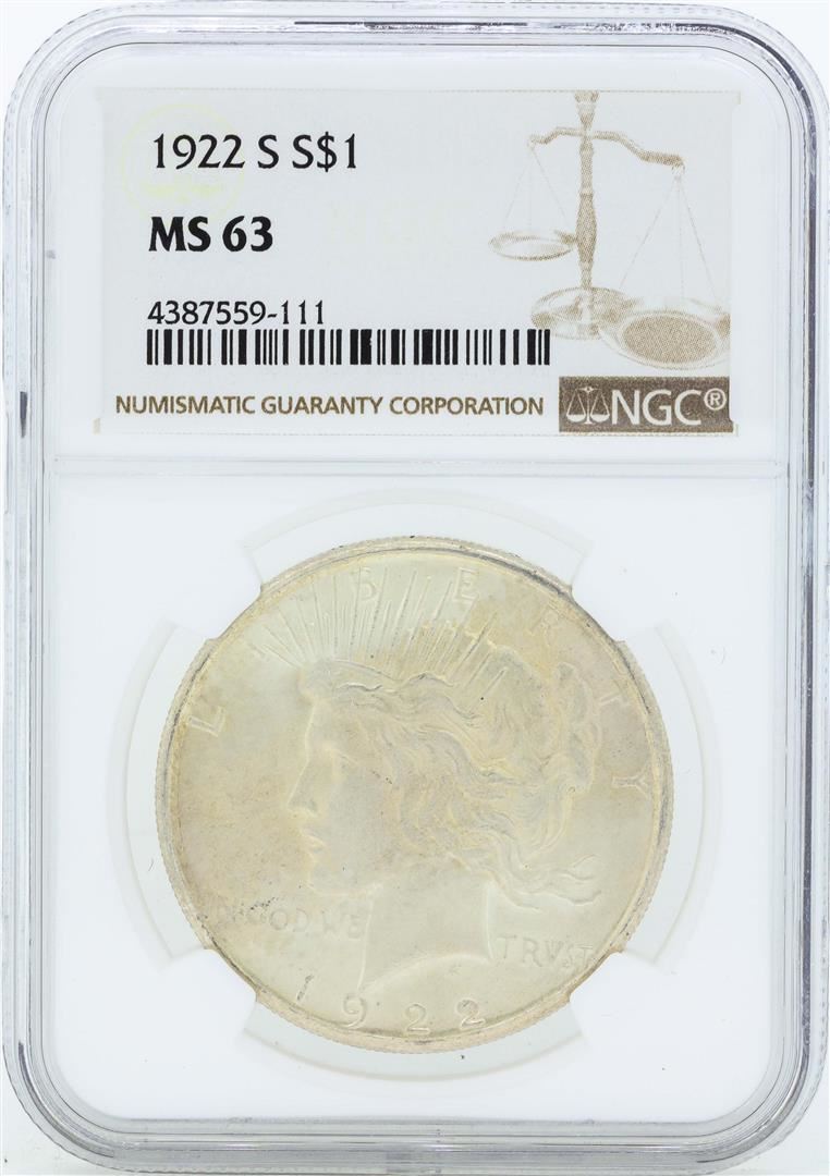 One 1922-S $1 Peace Silver Dollar Coin NGC MS63. NGC Certified.