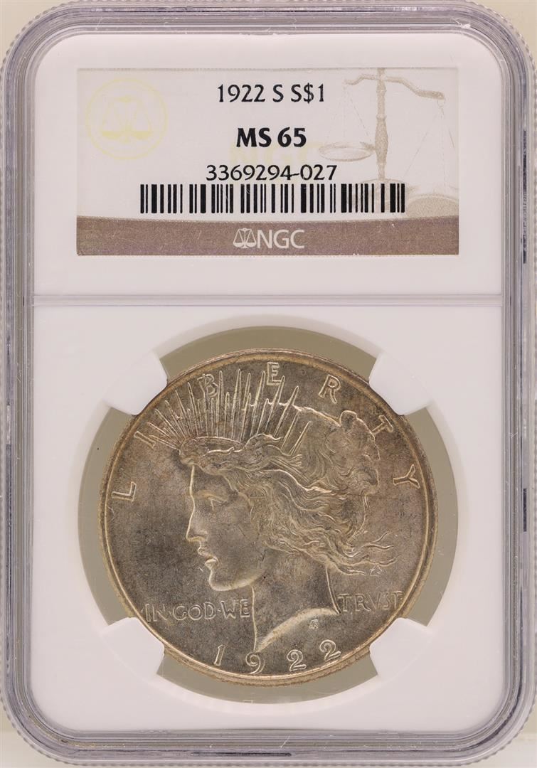 One 1922-S $1 Peace Silver Dollar Coin NGC MS65. NGC Certified.