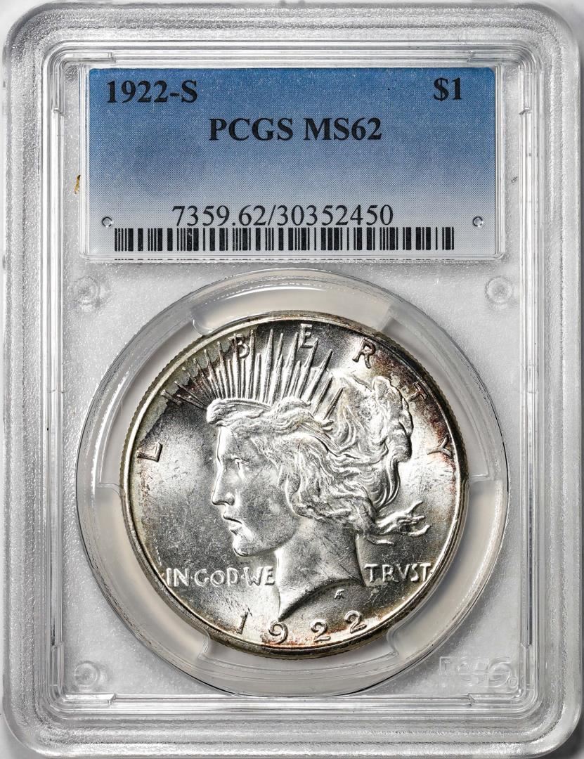 One 1922-S $1 Peace Silver Dollar Coin PCGS MS62. PCGS Graded.