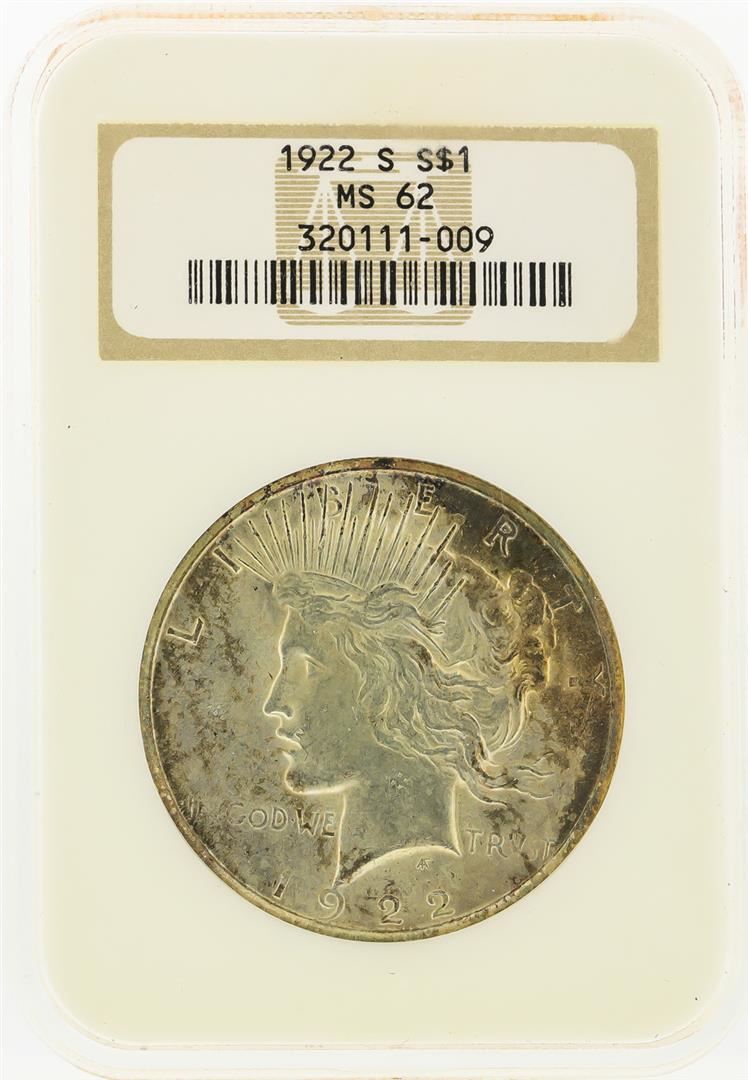 One 1922-S $1 Peace Silver Dollar NGC Graded MS62. NGC Certified.