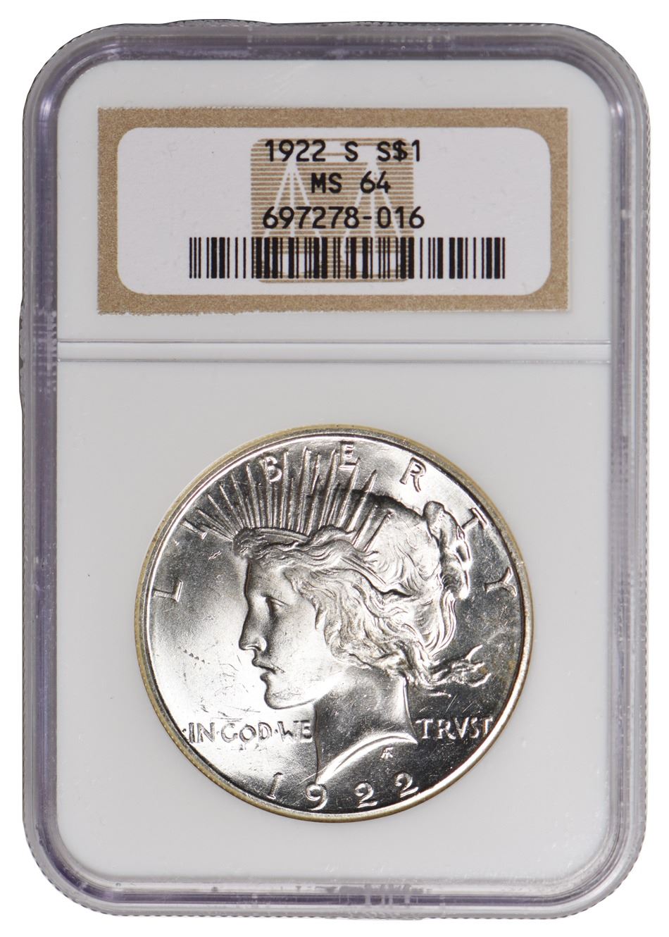 One 1922-S $1 Peace Silver Dollar NGC MS64.