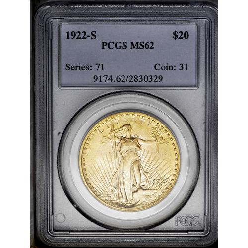 <B>1922-S<$20> MS62 PCGS.</B></I> Very well struck for this conditionally scarce S-mint, with attractive lemon-yellow highlights at the margins. A few more serious abrasions are noticed in the obverse, but the overall eye appeal is nothing short of outstanding for such a modest Mint State rating.<BR><I>From The Steve Glenn Collection.</B></I> <BR><BR><B>Important notice:</B> Heritage usually auctions material at the rate of 200-250 lots per hour. On some occasions eBay Live bid software or the Internet may not be able to keep up with the pace of the auction. We recommend placing a realistic absentee bid now as insurance to avoid disappointment. Occasionally the auctioneer may eliminate or reject an eBay Live bid, and the auctioneer may also reopen a lot after the close of the eBay live bidding (usually because we missed an audience bid), and may reject your bid even if it shows you as the winning bidder. By bidding via eBay Live, you agree that Heritage may award the lot to another bidder at its sole discretion under the circumstances described above or any other reasonable circumstances. Since eBay bids are not shown to us until we open the lot on the floor, we treat those bids just like floor bids. In most cases the floor responds before the eBay bid is presented to us, due to Internet lag time, so for consistency we have made it a policy that floor bids are always considered first over tie eBay live bids. Also please note that all Heritage lots purchased through eBay Live carry a 20% Buyer's Premium. Please make sure you read the Terms and Conditions before you bid. This lot is being auctioned in conjunction with a live floor auction by Heritage Galleries & Auctioneers. All final auction and invoice information will be supplied by Heritage Galleries & Auctioneers, and all other information should be considered preliminary. Lot:4677 <BR><BR><B>Winning Notification and Billing:</B> After the FINAL session in this auction is complete, Heritage will send e-mail and snail mail invoices. This process normally takes several days. All final auction and invoice information will be supplied by Heritage Galleries & Auctioneers, and all other information should be considered preliminary. <BR><BR>This auction will be conducted on a live auction floor and over the Internet through eBay Live. If you choose to place an absentee bid, please take a moment to <font color='#0000ff'><u><a href='http://pages.ebay.com/liveauctions/help/before/laabsentee.html'>learn how eBay Live absentee bidding works</a></u></font><font color='#000000'>