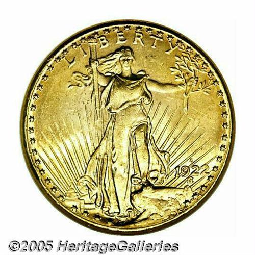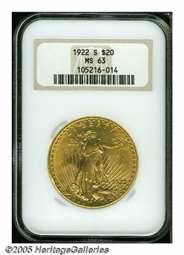 1922-S $20 MS63 NGC. As an issue, the heavily mel