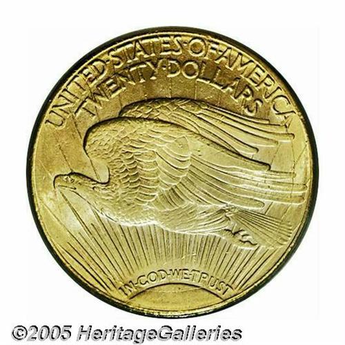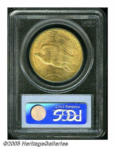 <B>1922-S<$20> MS63 PCGS.</B></I> Because of the small hoards of this issue that were found in Europe over the past twenty years, the 1922-S is now somewhat more obtainable (and affordable) for the average collector. Its status is now similar to other semi-key issues such as the 1913-S and 1915. While not completely struck up, the surfaces of this piece are softly frosted and show even, golden-rose coloration. Lightly abraded.
