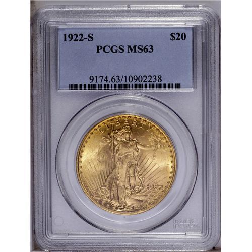 <B>1922-S<$20> MS63 PCGS.</B></I> Lovely coloration, the peripheries are slightly darker in hue than the centers. Very colorful and lustrous, there are a few small abrasions and several tiny rim ticks particularly on the obverse. <BR><BR><B>Important notice:</B> Heritage usually auctions material at the rate of 200-250 lots per hour. On some occasions eBay Live bid software or the Internet may not be able to keep up with the pace of the auction. We recommend placing a realistic absentee bid now as insurance to avoid disappointment. Occasionally the auctioneer may eliminate or reject an eBay Live bid, and the auctioneer may also reopen a lot after the close of the eBay live bidding (usually because we missed an audience bid), and may reject your bid even if it shows you as the winning bidder. By bidding via eBay Live, you agree that Heritage may award the lot to another bidder at its sole discretion under the circumstances described above or any other reasonable circumstances. Since eBay bids are not shown to us until we open the lot on the floor, we treat those bids just like floor bids. In most cases the floor responds before the eBay bid is presented to us, due to Internet lag time, so for consistency we have made it a policy that floor bids are always considered first over tie eBay live bids. Also please note that all Heritage lots purchased through eBay Live carry a 20% Buyer's Premium. Please make sure you read the Terms and Conditions before you bid. This lot is being auctioned in conjunction with a live floor auction by Heritage Galleries & Auctioneers. All final auction and invoice information will be supplied by Heritage Galleries & Auctioneers, and all other information should be considered preliminary. Lot:4678 <BR><BR><B>Winning Notification and Billing:</B> After the FINAL session in this auction is complete, Heritage will send e-mail and snail mail invoices. This process normally takes several days. All final auction and invoice information will be supplied by Heritage Galleries & Auctioneers, and all other information should be considered preliminary. <BR><BR>This auction will be conducted on a live auction floor and over the Internet through eBay Live. If you choose to place an absentee bid, please take a moment to <font color='#0000ff'><u><a href='http://pages.ebay.com/liveauctions/help/before/laabsentee.html'>learn how eBay Live absentee bidding works</a></u></font><font color='#000000'>