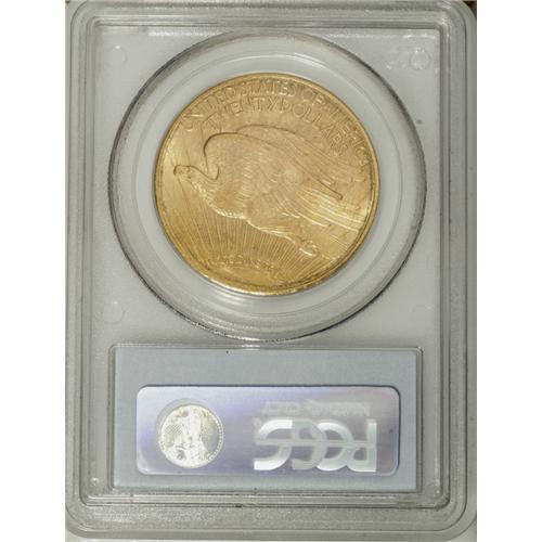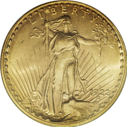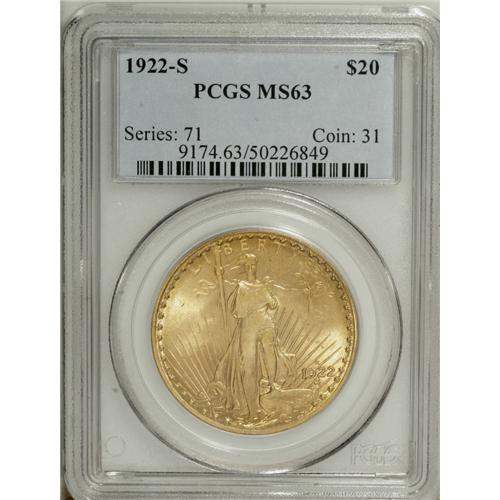 <B>1922-S $20 MS63 PCGS.</B></I> This is a delightful example with brilliant and frosty yellow-gold surfaces. A curving, shallow blemish affects several of the sun's rays in the right obverse field. Both sides have noticeable die polish lines and die cracks, especially on the reverse. Although still a scarce issue today, the 1922-S was once considered a major rarity in the series.<BR><BR><b>Shipping:</b> Coin/Currency (<a target="_blank" href="http://www.heritageauctions.com/common/shipping.php">view shipping information</a>)