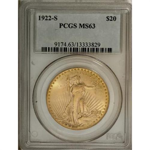 <B>1922-S $20 MS63 PCGS.</B></I> This is a lustrous honey-gold example with a few small marks, the most notable occurring on the eagle's thigh. Some localized softness is noted on both sides, but in general the design elements are well defined. This date suffered from the massive meltings of the 1930s.<BR><I>From The Parker Lee III Collection.</B></I><BR><BR><B>Coin Engraver:</B> Augustus Saint-Gaudens<BR><BR><b>Shipping:</b> Coins & Currency (<a target="_blank" href="http://www.heritageauctions.com/common/shipping.php">view shipping information</a>)