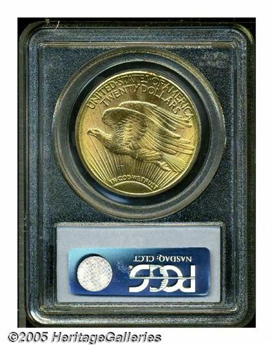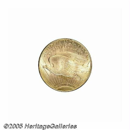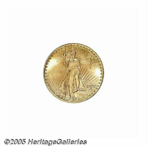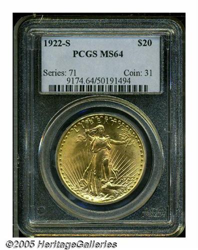 <B>1922-S<$20> MS64 PCGS.</B></I> Brilliant and frosty with outstanding eye appeal. The 1922-S is not rare in absolute terms, but is certainly scarce at the MS64 level, especially in comparison with most of the Philadelphia Mint issues of the 1920s. Examples this fine comprise just a small portion of the total Uncirculated population, and are not capable of accommodating the demand created by the growing coterie of Saint-Gaudens enthusiasts.