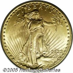 <B>1922-S $20 MS64 PCGS.</B></I> Second of three high grade examples of this scarce, semi-key issue. This piece shows remarkable mint luster that rolls around each side as the coin is slowly tilted beneath a light source. Sharply defined, the only mentionable surface defect is a shallow planchet flaw in the upper left obverse field.