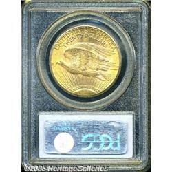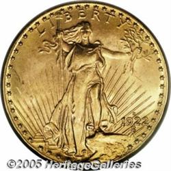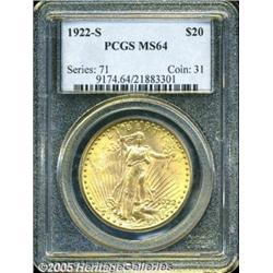 <B>1922-S $20 MS64 PCGS.</B></I> This beautiful near-Gem has spectacular eye appeal for the grade, and looks like an elusive MS65 when viewed from the obverse alone. The reverse has a few noticeable abrasions, hence the MS64 grade. Well struck and fully lustrous, a beautiful example of this scarcer issue that becomes a major condition rarity at the full Gem level.