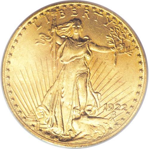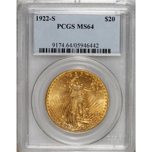 <B>1922-S $20 MS64 PCGS.</B></I> With a documented mintage of 2,658,000 pieces, one would expect the 1922-S double eagle to be readily available in quantity for collectors, even in high grade. This is simply not the case and the ubiquitous melting of gold coins during the 1930s is likely the cause. Finding a high grade example can be especially challenging. In fact, the Eliasberg specimen, although not certified, was graded MS63 and the finest example in the Smithsonian Institute collection is considered to be an MS62. This near-Gem is just about as good as it gets for this elusive date. In fact, PCGS has graded only 12 pieces above the MS64 level. Fully struck throughout, the surfaces are lightly frosted and show a slight overlay of reddish patina with no mentionable marks.<BR><BR><b>Shipping:</b> Coins & Currency (<a target="_blank" href="http://www.heritageauctions.com/common/shipping.php">view shipping information</a>)