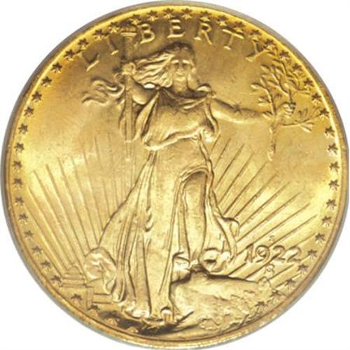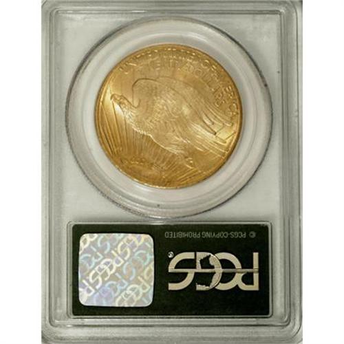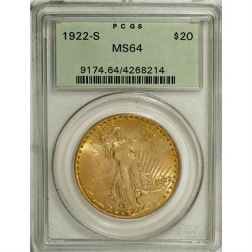 <B>1922-S $20 MS64 PCGS.</B></I> For ten years, the 1922-S could be obtained at face value from the Treasury. Few took the offer, and after Roosevelt's 1933 gold recall, the 1922-S emerged as a scarcity. The 1922-S has approximately double the mintage of the 1922, yet is much more difficult to locate. This lustrous yellow-gold near-Gem has pleasing preservation for an MS64, although a star is incused above Liberty's extended arm. Encased in a green label holder.<BR><I>From The Vanek Collection.</B></I><BR><BR><b>Shipping:</b> Coins & Currency (<a target="_blank" href="http://www.heritageauctions.com/common/shipping.php">view shipping information</a>)