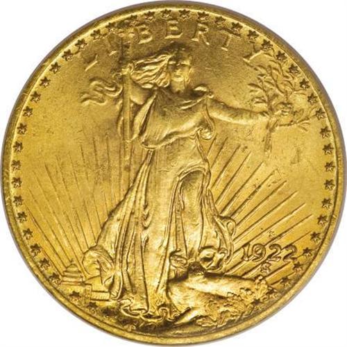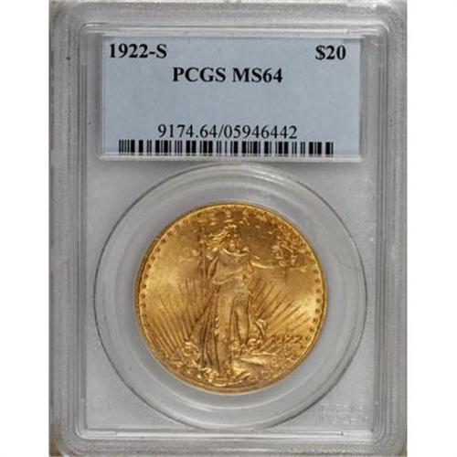<B>1922-S $20 MS64 PCGS.</B></I> With a documented mintage of 2,658,000 pieces, one would expect the 1922-S double eagle to be readily available in quantity for collectors, even in high grade. This is simply not the case and the ubiquitous melting of gold coins during the 1930s is likely the cause. Finding a high grade example can be especially challenging. In fact, the Eliasberg specimen, although not certified, was graded MS63, and the finest example in the Smithsonian Institute collection is considered to be an MS62. This near-Gem is just about as good as it gets for this elusive date. In fact, PCGS has graded only 12 pieces above the MS64 level. Fully struck throughout, the surfaces are lightly frosted and show a slight overlay of reddish patina with no mentionable marks. <BR><BR><B>Coin Engraver:</B> Augustus Saint-Gaudens<BR><BR><b>Shipping:</b> Coins & Currency (<a target="_blank" href="http://www.heritageauctions.com/common/shipping.php">view shipping information</a>\)