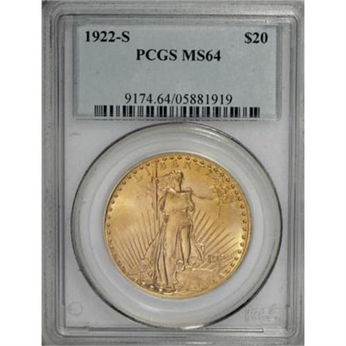 <B>1922-S $20 MS64 PCGS.</B></I> The 1922-S was heavily melted in the 1930s. This near-Gem survivor displays vibrant luster emanating from peach-gold surfaces imbued with traces of mint-green. A solid strike brings out sharp definition on most of the design features. We note a few marks, the most notable located in the area of Liberty's left (right facing) breast.<BR><BR><B>Coin Engraver:</B> Augustus Saint-Gaudens<BR><BR><b>Shipping:</b> Coins & Currency (<a target="_blank" href="http://www.heritageauctions.com/common/shipping.php">view shipping information</a>)