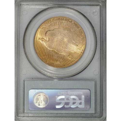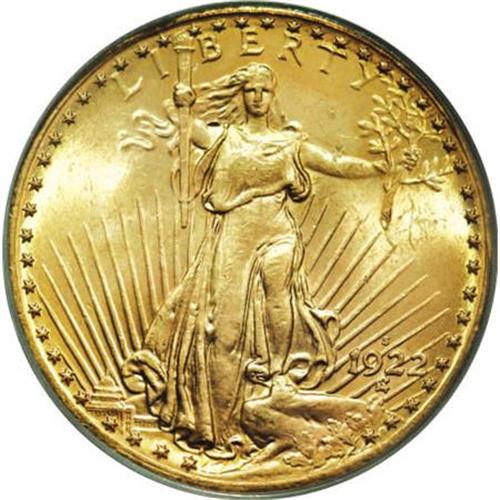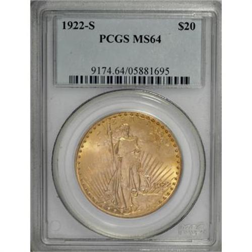 <B>1922-S $20 MS64 PCGS.</B></I> Near-Gem is the finest grade 1922-S double eagle that most collectors can hope to own, as the issue becomes a major rarity at the MS65 level. Indeed, PCGS has seen only 12 Gems. Vibrant luster adorns the apricot-gold surfaces of this gorgeous MS64 example, and a suitable strike sharpens the design elements. A scattering of minute marks limits the grade.<BR><BR><B>Coin Engraver:</B> Augustus Saint-Gaudens<BR><BR><b>Shipping:</b> Coins & Currency (<a target="_blank" href="http://www.heritageauctions.com/common/shipping.php">view shipping information</a>)