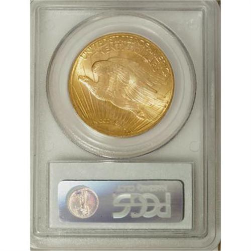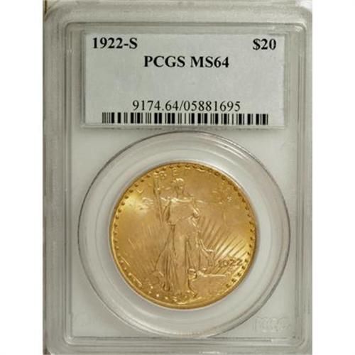 <B>1922-S $20 MS64 PCGS.</B></I> Near-Gem is the finest grade 1922-S double eagle that most collectors can hope to own, as the issue becomes a major rarity at the MS65 level. Indeed, PCGS has seen only 12 Gems (3/08). Vibrant luster adorns the apricot-gold surfaces of this gorgeous MS64 example, and an above-average strike yields sharp design elements. Minimally marked for the grade and a visual delight.<BR><BR><B>Coin Engraver:</B> Augustus Saint-Gaudens<BR><BR><b>Shipping:</b> Coins & Currency (<a target="_blank" href="http://www.heritageauctions.com/common/shipping.php">view shipping information</a>)