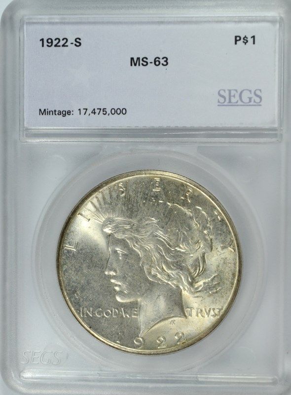 1922-S PEACE SILVER DOLLAR, SEGS MS-63 NICE!