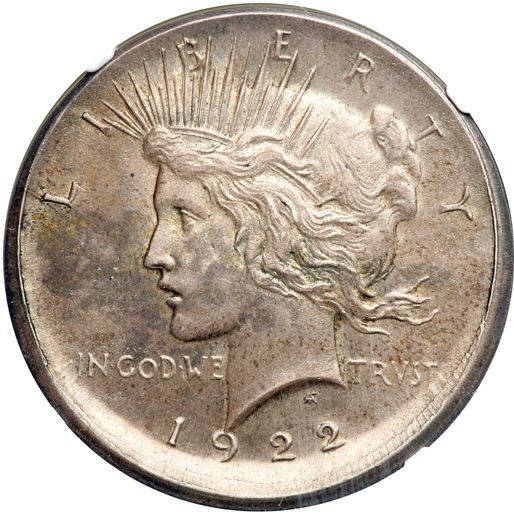 1922-S Peace Dollar. NGC graded Mint Error MS-61. Evenly toned. The broadstruck error coin happens when a coin is struck without the collar present to form the rim that is part of the coin shape. The reason for the lack of the collar is very simple. In all coinage presses used in the U.S. Mints, the bedplate in which the collar is located is mounted on springs. This allows the bedplate and collar to retract and "give" if an accident should occur. The accident would be one where the dies slam down against the collar or against a jam-up of blanks which would cause excessive resistance to the downward motion of the hammer dies in a regular down stroke. If the collar was rigidly mounted there would be quite a bit of mechanical damage created in such an accident. This is an integral part of the design of the press.