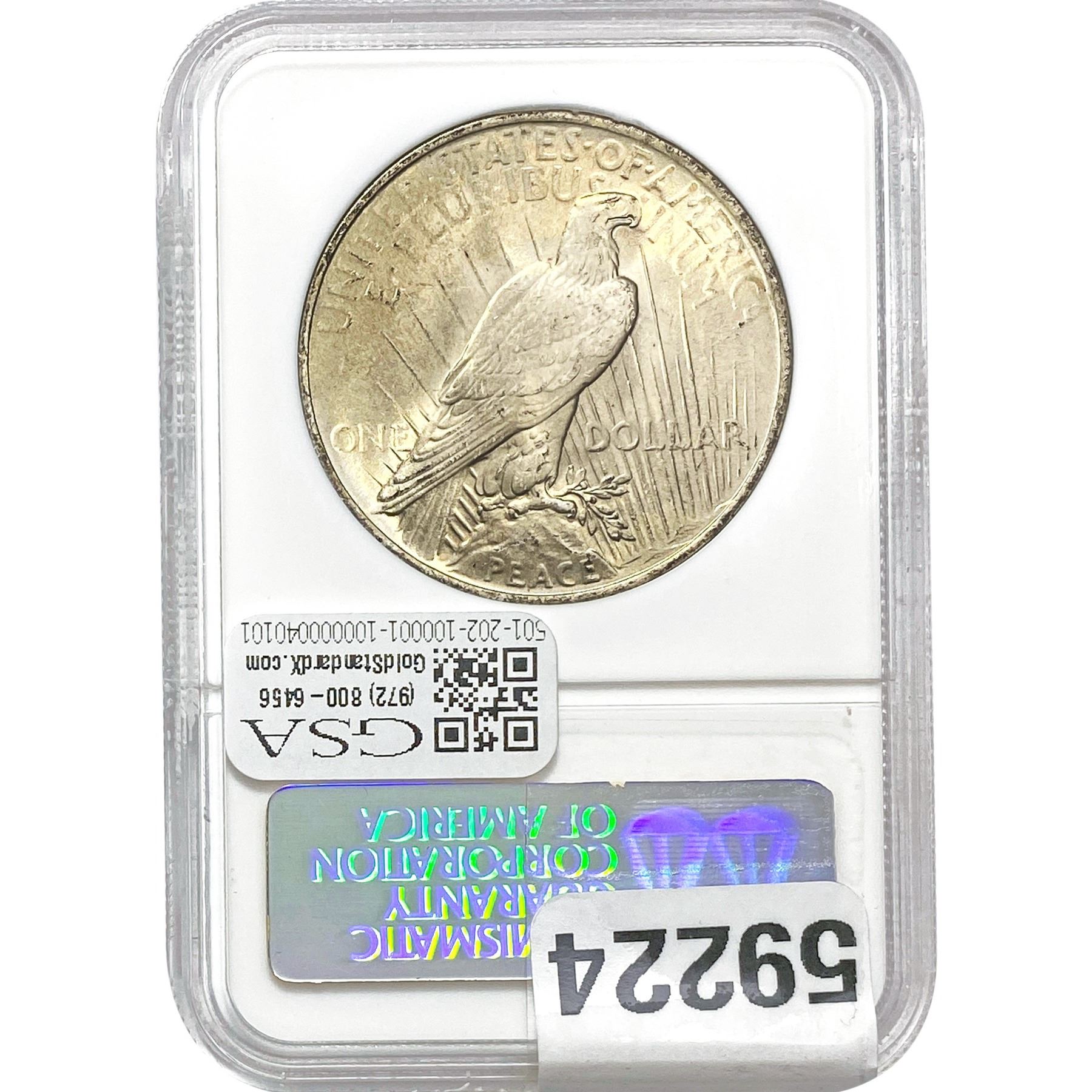 e. Coins sold referencing a third-party grading service are sold “AS IS” without any express or implied warranty, except for a guarantee by GSA that they are genuine. Removal or alteration of the holder, voids all of Bidder’s claims concerning that Product. Certain warranties may be available from the grading services and Bidders are referred to them for further details: Numismatic Guaranty Corporation (NGC), PO Box 4776, Sarasota, FL 34230, www.ngccoin.com/services/writtenguarantee.asp; Professional Coin Grading Services (PCGS), PO Box 9458, Newport Beach, CA 92658, www.pcgs.com/guarantee.html; ANACS, 6555 S. Kenton St., Ste. 303, Englewood, CO 80111; and Independent Coin Grading Co. (ICG), 7901 East Bellview, Ave., Suite 50, Englewood, CO 80111.
