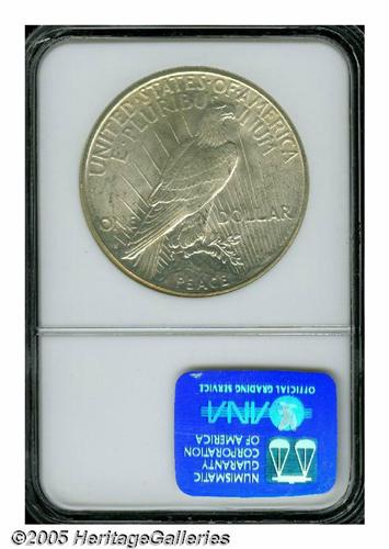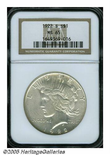 <B>1922-S<S$1> MS65 NGC.</B></I> The 1922-S is a problem issue for collectors for two reasons, heavy abrasions and a soft strike. This particular coin is one of the few that does not exhibit either of these characteristics. The striking details are uncommonly strong for the issue; in fact, almost rivaling that found on a 1923-P. There are also no obvious abrasions on either side, save for a fairly superficial scrape on the eagle's leg. Just six pieces have been graded finer, by NGC (5/05).