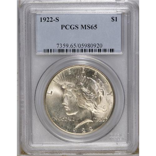 <B>1922-S S$1 MS65 PCGS.</B></I> Dazzling luster radiates from well preserved surfaces that display just the slightest hint of light gold-tan color under magnification. The design elements are typically struck, with some softness noted in the centers. Light die polish lines are observed in the right obverse field, and a fine die crack travels from beneath the R in LIBERTY through the cap to the Y. A few minute contact marks are consistent with the grade.<BR><BR><b>Shipping:</b> Coins & Currency (<a target="_blank" href="http://www.heritageauctions.com/common/shipping.php">view shipping information</a>)