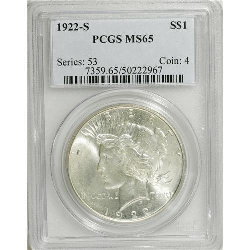 <B>1922-S S$1 MS65 PCGS.</B></I> Remarkably well struck and attractively preserved, with flashy, dynamic luster on both sides. This lovely Gem is essentially free of color, but some milky patina is noted mostly on the obverse. Conditionally scarce as a Gem and rare any finer, with just 16 pieces graded at MS66 by NGC and PCGS combined, and none finer (1/07).<BR><BR><b>Shipping:</b> Coins & Currency (<a target="_blank" href="http://www.heritageauctions.com/common/shipping.php">view shipping information</a>)