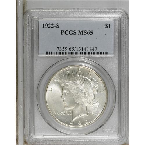 <B>1922-S S$1 MS65 PCGS.</B></I> The 1922-S dollar carries less than a good reputation. David Bowers (2006), for example, says: "Usually poorly struck; an aesthetic disaster." The Gem presented here is an obvious exception. While not necessarily full, the strike is solid; nice delineation is apparent in Liberty's hair. Untoned surfaces exhibit dazzling luster, and both sides are impeccably preserved. PCGS has seen only six pieces finer.<BR><BR><b>Shipping:</b> Coins & Currency (<a target="_blank" href="http://www.heritageauctions.com/common/shipping.php">view shipping information</a>)