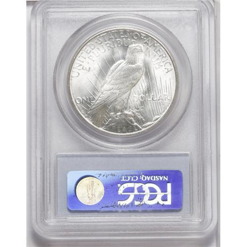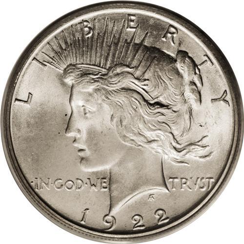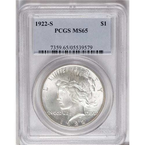 <B>1922-S<img border='0' src='http://www.heritagecoins.com/images/star.gif' width=10 height=10>$1> MS65 PCGS.</B></I> This is a fully lustrous Gem with sharp design elements and exceptional eye appeal. There is no evidence of toning on either side of this example. Although the '22-S Peace dollar is not a major condition rarity like some other issues in the series, it is still elusive in Gem condition, and finer examples are nearly impossible to locate. In fact, PCGS has only certified six better examples of this date (8/06).