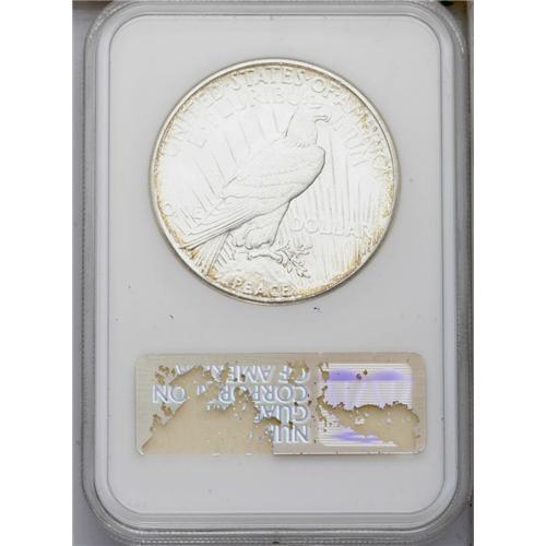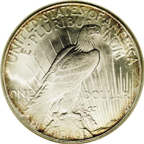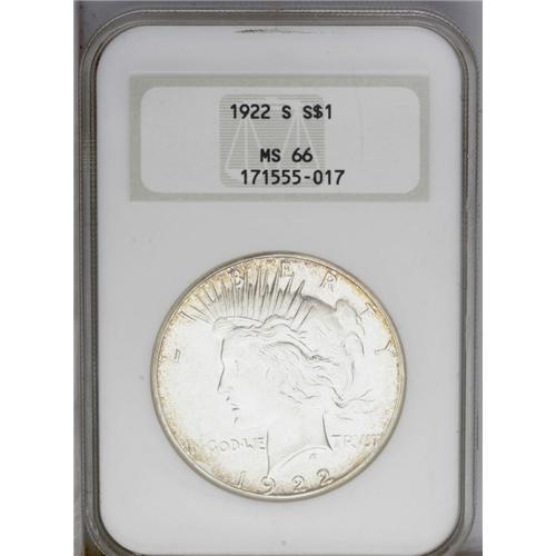 <B>1922-S<img border='0' src='http://www.heritagecoins.com/images/star.gif' width=10 height=10>$1> MS66 NGC.</B></I> As with most S-mint Peace dollars, the most important determinant of grade and price for a 1922-S is the relative strength of strike. This piece cannot compare to a P or D-mint, but for a 1922-S the strike on this coin is about as strong as one is likely to locate. This is especially true of the lower row of feathers on the eagle's wing. The feathers are not fully brought up, but they are all present. The center of the obverse shows only a slight softness of detail on Liberty's hair. The surfaces are bright and frosted, as usual for S-mint coinage. Both sides are generally brilliant with a thin ring of golden around the margins. A faint ring of haziness is seen in the lower left obverse field, a possible future pedigree identifier. Seldom seen in Gem or better grades, only seven other pieces have been so graded by NGC and six at PCGS, with none finer at either service.<BR><I>From The Robert Moreno Registry Collection of Peace Dollars.</B></I>