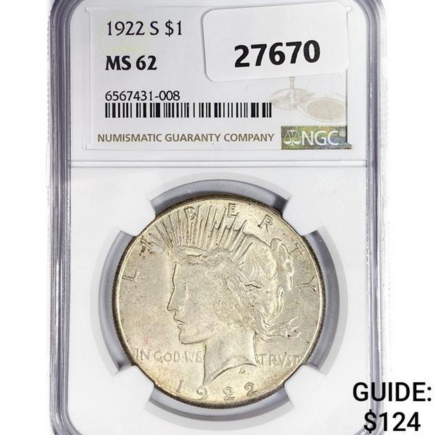 1922-S Silver Peace Dollar NGC MS62