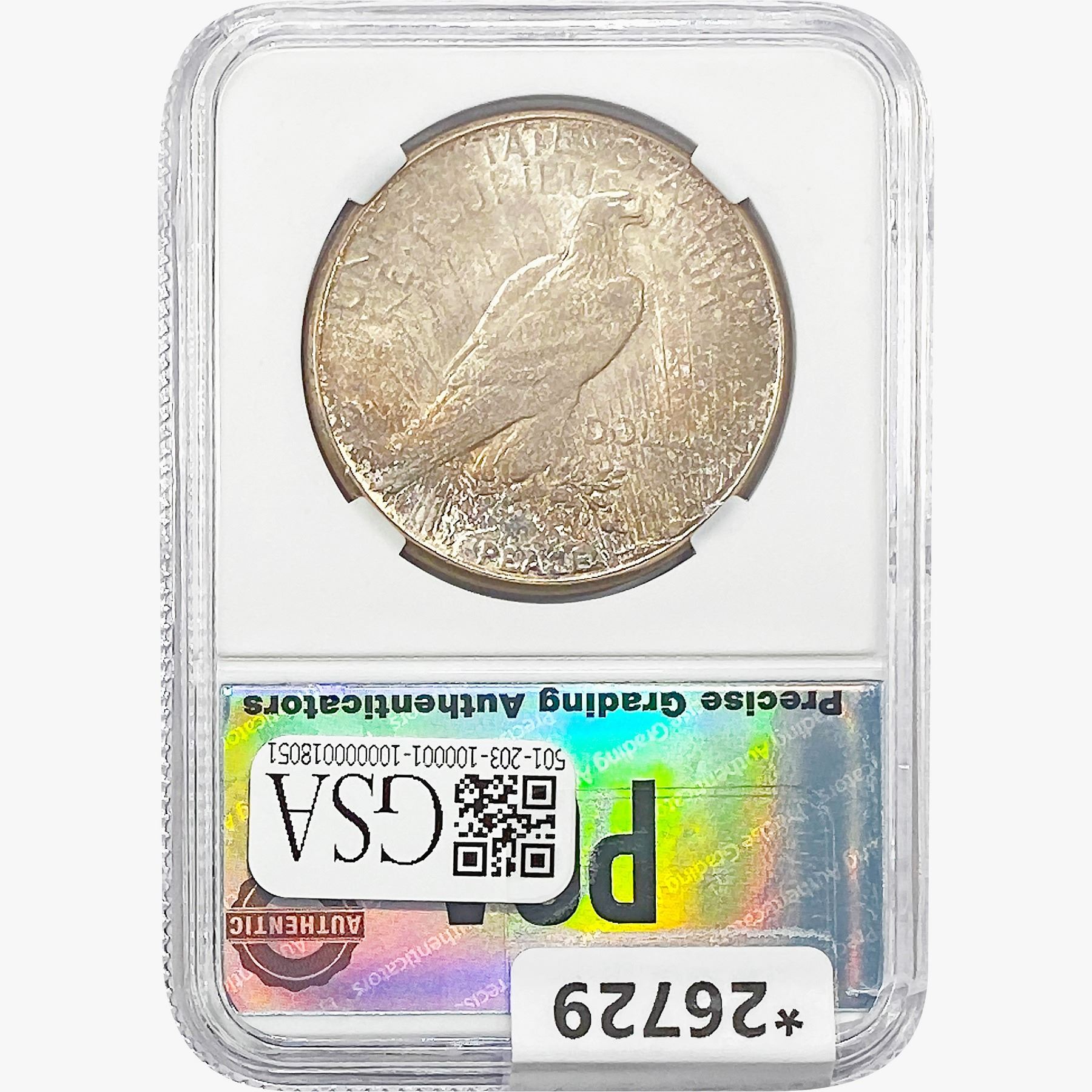 COINS AND CURRENCY LISTED IN GSA’S CATALOG AS GRADED AND ENCAPSULATED BY PCGS, NGC, ANACS, ICG, PCGS CURRENCY, PMG, PCGS BANKNOTE GRADING, CMC OR ANY OTHER THIRD-PARTY GRADING SERVICE ARE LIKEWISE SOLD “AS-IS” EXCEPT AS EXPRESSLY SET FORTH HEREIN. ALL THIRD-PARTY GRADING SERVICE GUARANTEES, INCLUDING AUTHENTICITY, ARE THE SOLE RESPONSIBILITY OF THE THIRD-PARTY GRADING SERVICE AND NOT WARRANTIES OR GUARANTEES OF GSA. BIDDERS SHOULD CONTACT THESE THIRD-PARTY GRADING SERVICES DIRECTLY WITH RESPECT TO ANY CLAIMS OR QUESTIONS THEY MAY HAVE CONCERNING THEIR GUARANTEES AND WARRANTIES. BIDDERS ACKNOWLEDGE AND AGREE THAT AUCTIONEER IS NOT BOUND BY OR LIABLE FOR ANY OPINION OR CERTIFICATION BY ANY THIRD-PARTY GRADING SERVICE. REMOVAL OF A PRODUCT FROM ITS PROTECTIVE CASING OR HOLDER OR ALTERATION OF ANY COIN HOLDER WAIVES ALL RIGHTS CONCERNING THE PRODUCT CONTAINED THEREIN.