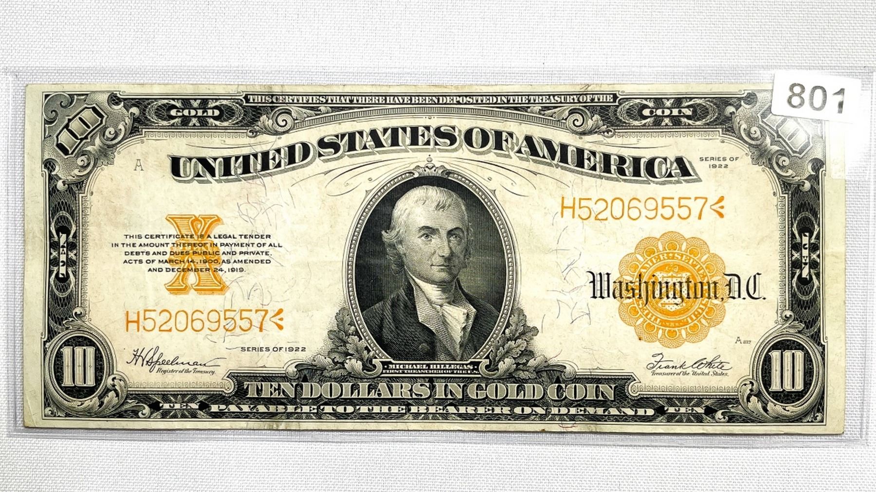 1922 Series $10 Gold Certificate CLOSELY UNC