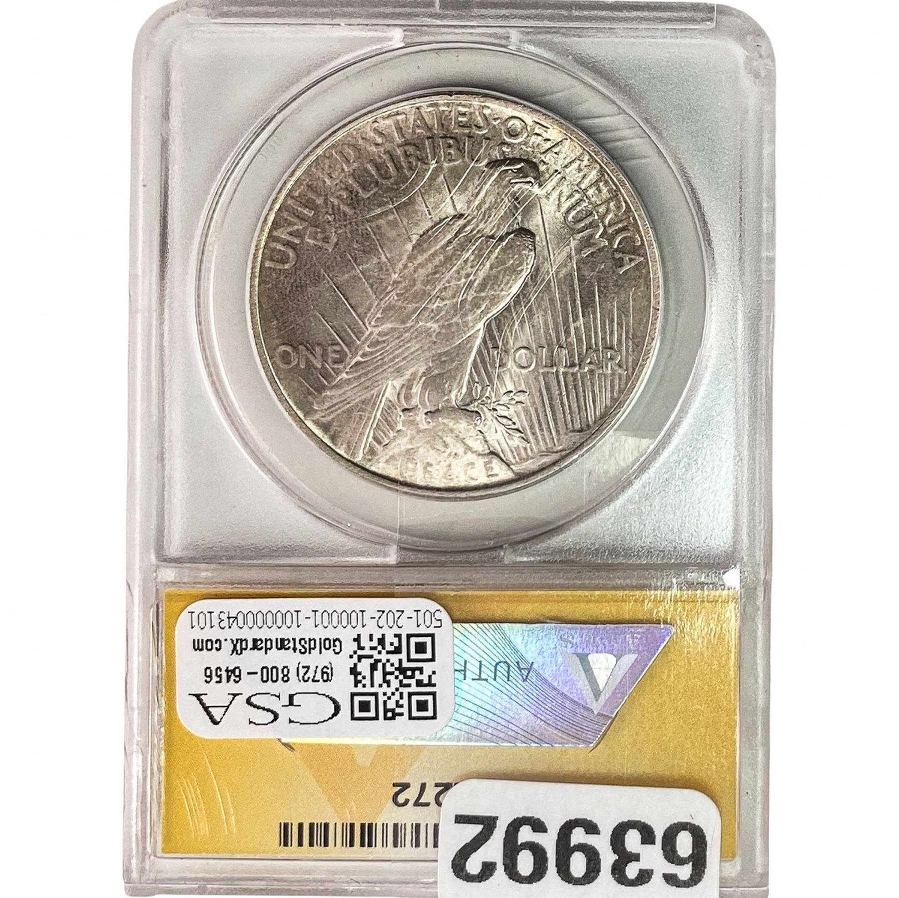 COINS AND CURRENCY LISTED IN GSA’S CATALOG AS GRADED AND ENCAPSULATED BY PCGS, NGC, ANACS, ICG, PCGS CURRENCY, PMG, PCGS BANKNOTE GRADING, CMC OR ANY OTHER THIRD-PARTY GRADING SERVICE ARE LIKEWISE SOLD “AS-IS” EXCEPT AS EXPRESSLY SET FORTH HEREIN. ALL THIRD-PARTY GRADING SERVICE GUARANTEES, INCLUDING AUTHENTICITY, ARE THE SOLE RESPONSIBILITY OF THE THIRD-PARTY GRADING SERVICE AND NOT WARRANTIES OR GUARANTEES OF GSA. BIDDERS SHOULD CONTACT THESE THIRD-PARTY GRADING SERVICES DIRECTLY WITH RESPECT TO ANY CLAIMS OR QUESTIONS THEY MAY HAVE CONCERNING THEIR GUARANTEES AND WARRANTIES. BIDDERS ACKNOWLEDGE AND AGREE THAT AUCTIONEER IS NOT BOUND BY OR LIABLE FOR ANY OPINION OR CERTIFICATION BY ANY THIRD-PARTY GRADING SERVICE. REMOVAL OF A PRODUCT FROM ITS PROTECTIVE CASING OR HOLDER OR ALTERATION OF ANY COIN HOLDER WAIVES ALL RIGHTS CONCERNING THE PRODUCT CONTAINED THEREIN.