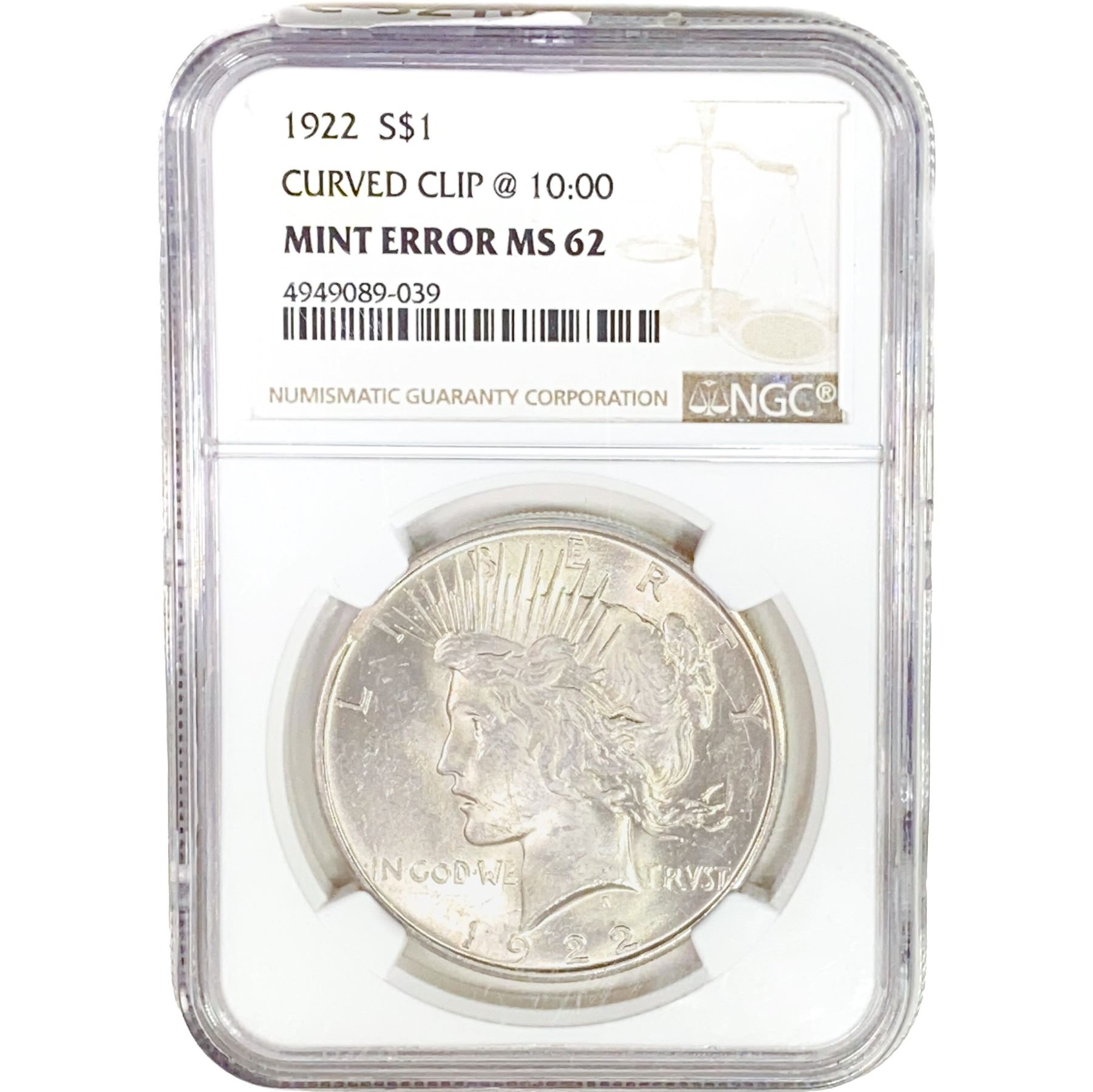 1922 Silver Peace Dollar NGC MS62 Curved Clip @10: