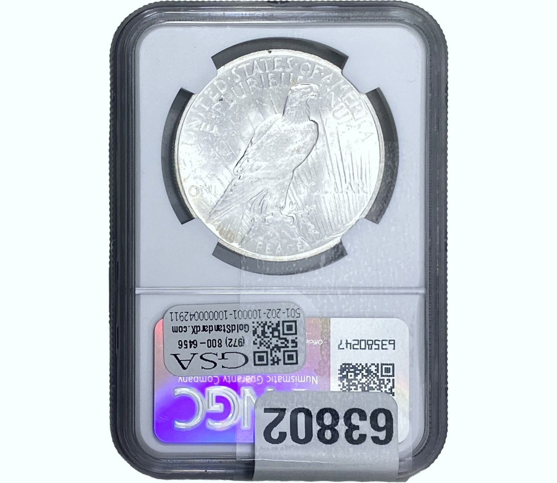 e. Coins sold referencing a third-party grading service are sold “AS IS” without any express or implied warranty, except for a guarantee by GSA that they are genuine. Removal or alteration of the holder, voids all of Bidder’s claims concerning that Product. Certain warranties may be available from the grading services and Bidders are referred to them for further details: Numismatic Guaranty Corporation (NGC), PO Box 4776, Sarasota, FL 34230, www.ngccoin.com/services/writtenguarantee.asp; Professional Coin Grading Services (PCGS), PO Box 9458, Newport Beach, CA 92658, www.pcgs.com/guarantee.html; ANACS, 6555 S. Kenton St., Ste. 303, Englewood, CO 80111; and Independent Coin Grading Co. (ICG), 7901 East Bellview, Ave., Suite 50, Englewood, CO 80111.