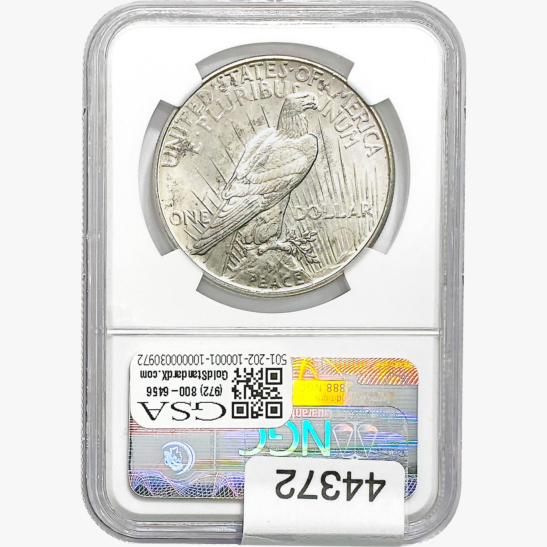 e. Coins sold referencing a third-party grading service are sold “AS IS” without any express or implied warranty, except for a guarantee by GSA that they are genuine. Removal or alteration of the holder, voids all of Bidder’s claims concerning that Product. Certain warranties may be available from the grading services and Bidders are referred to them for further details: Numismatic Guaranty Corporation (NGC), PO Box 4776, Sarasota, FL 34230, www.ngccoin.com/services/writtenguarantee.asp; Professional Coin Grading Services (PCGS), PO Box 9458, Newport Beach, CA 92658, www.pcgs.com/guarantee.html; ANACS, 6555 S. Kenton St., Ste. 303, Englewood, CO 80111; and Independent Coin Grading Co. (ICG), 7901 East Bellview, Ave., Suite 50, Englewood, CO 80111.