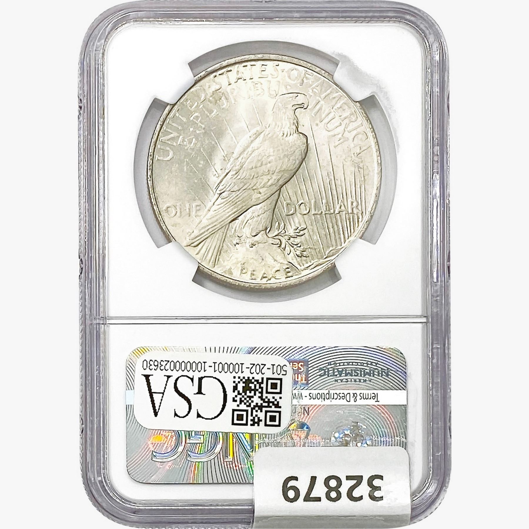COINS AND CURRENCY LISTED IN GSA’S CATALOG AS GRADED AND ENCAPSULATED BY PCGS, NGC, ANACS, ICG, PCGS CURRENCY, PMG, PCGS BANKNOTE GRADING, CMC OR ANY OTHER THIRD-PARTY GRADING SERVICE ARE LIKEWISE SOLD “AS-IS” EXCEPT AS EXPRESSLY SET FORTH HEREIN. ALL THIRD-PARTY GRADING SERVICE GUARANTEES, INCLUDING AUTHENTICITY, ARE THE SOLE RESPONSIBILITY OF THE THIRD-PARTY GRADING SERVICE AND NOT WARRANTIES OR GUARANTEES OF GSA. BIDDERS SHOULD CONTACT THESE THIRD-PARTY GRADING SERVICES DIRECTLY WITH RESPECT TO ANY CLAIMS OR QUESTIONS THEY MAY HAVE CONCERNING THEIR GUARANTEES AND WARRANTIES. BIDDERS ACKNOWLEDGE AND AGREE THAT AUCTIONEER IS NOT BOUND BY OR LIABLE FOR ANY OPINION OR CERTIFICATION BY ANY THIRD-PARTY GRADING SERVICE. REMOVAL OF A PRODUCT FROM ITS PROTECTIVE CASING OR HOLDER OR ALTERATION OF ANY COIN HOLDER WAIVES ALL RIGHTS CONCERNING THE PRODUCT CONTAINED THEREIN.
