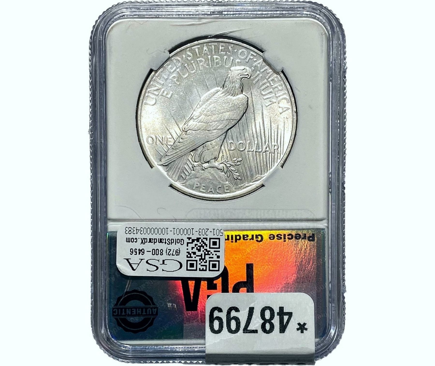 e. Coins sold referencing a third-party grading service are sold “AS IS” without any express or implied warranty, except for a guarantee by GSA that they are genuine. Removal or alteration of the holder, voids all of Bidder’s claims concerning that Product. Certain warranties may be available from the grading services and Bidders are referred to them for further details: Numismatic Guaranty Corporation (NGC), PO Box 4776, Sarasota, FL 34230, www.ngccoin.com/services/writtenguarantee.asp; Professional Coin Grading Services (PCGS), PO Box 9458, Newport Beach, CA 92658, www.pcgs.com/guarantee.html; ANACS, 6555 S. Kenton St., Ste. 303, Englewood, CO 80111; and Independent Coin Grading Co. (ICG), 7901 East Bellview, Ave., Suite 50, Englewood, CO 80111.
