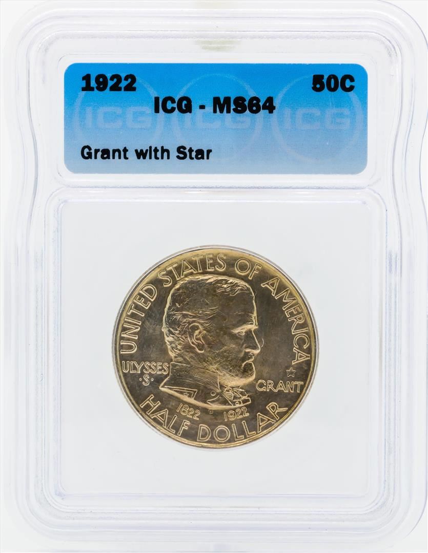 One 1922 Star Grant Commemorative Half Dollar Coin ICG MS64. ICG Certified.