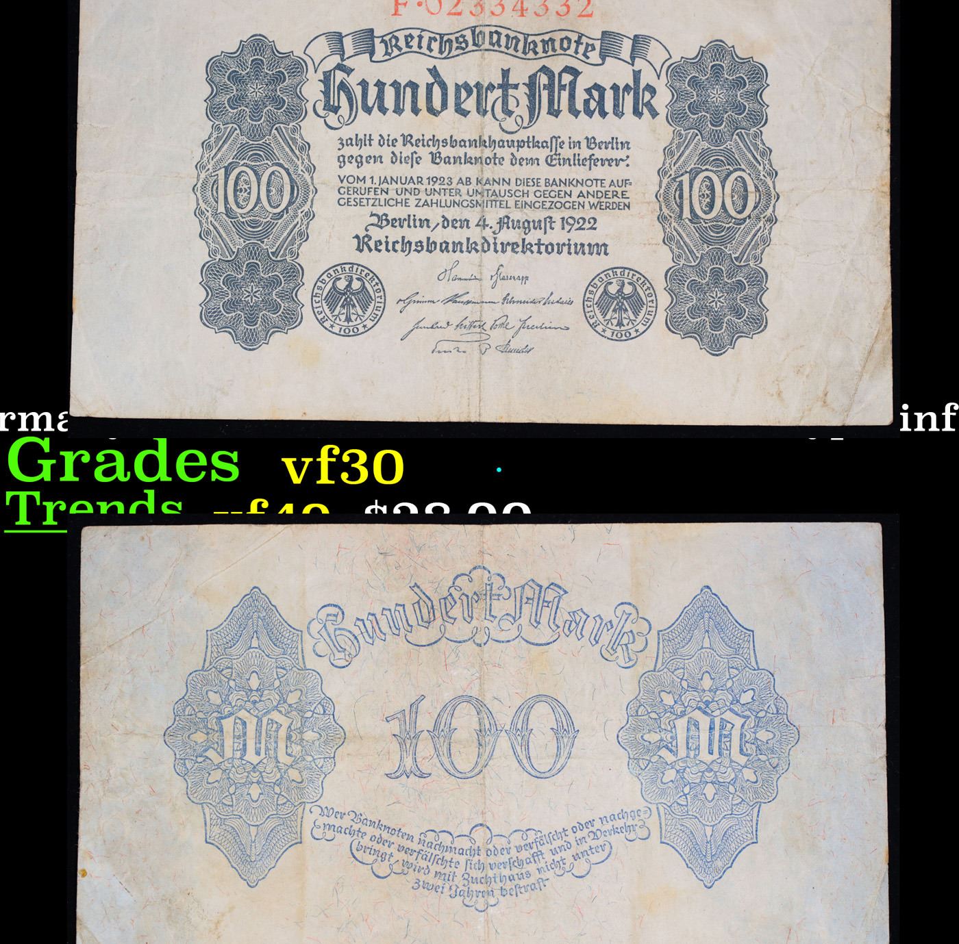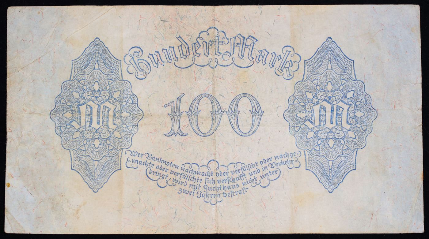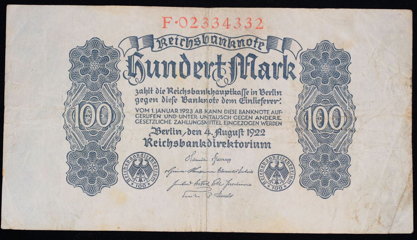 1922 Third Issue Germany (Weimar) 100 Marks Post-WWI Hyperinflation Banknote P# 75 Grades vf++. In the early 1920s, post-WWI Germany saw its economy spiraling out of control. Hyperinflation started directly after the war in 1918, but truly took over the Weimar Republic from 1921 to 1923. The value of the Mark declined incredibly rapidly. 1 USD was equal to 50 German Marks at the beginning of 1920. Toward the end of 1923, 1 USD was equal to over 4,200,000,000,000 German Marks. At times, denominations of the Mark became less valuable than the paper and labor to print it almost immediately after printing. Thus, denominations of the Mark notes became incredibly large, ending up in the tens of trillions.