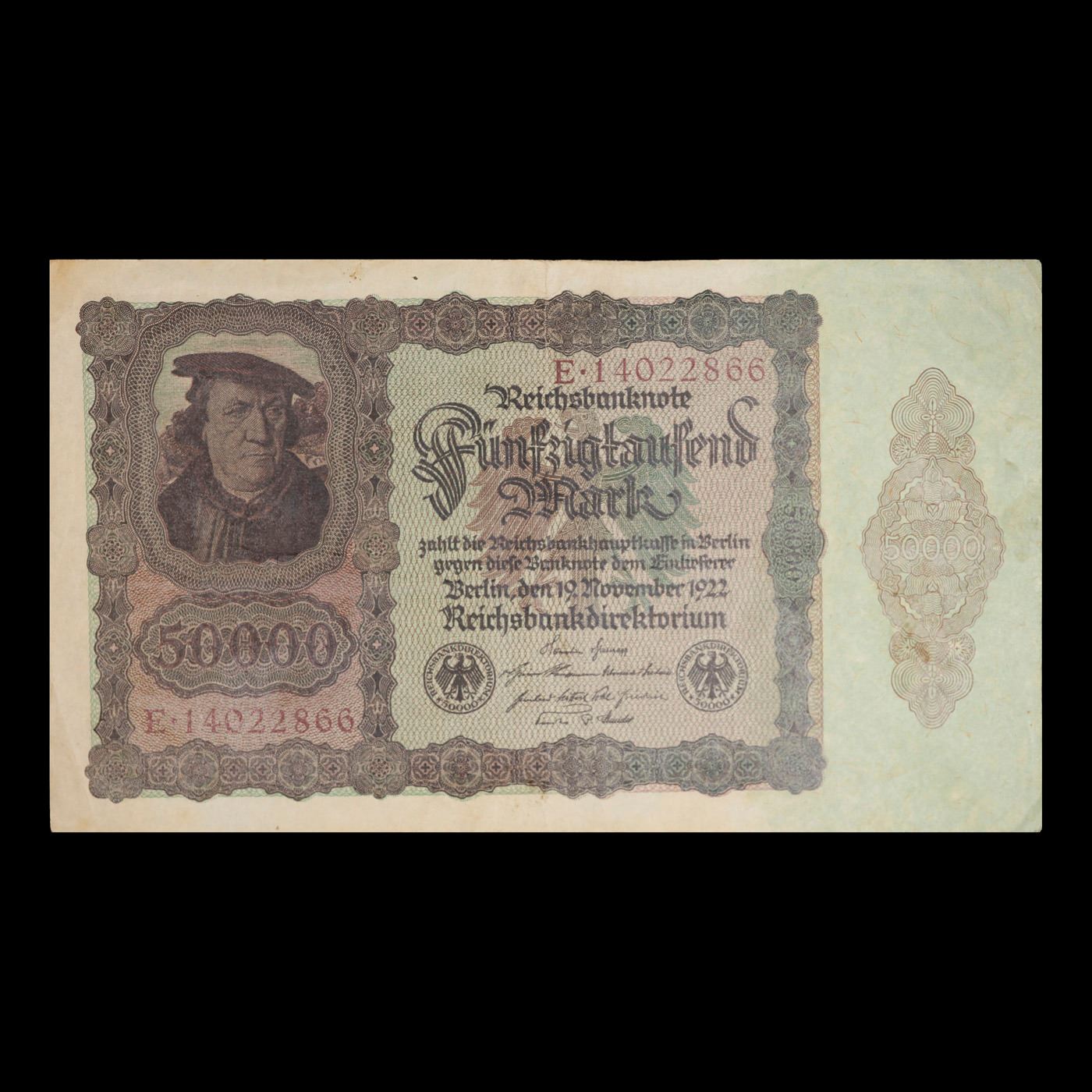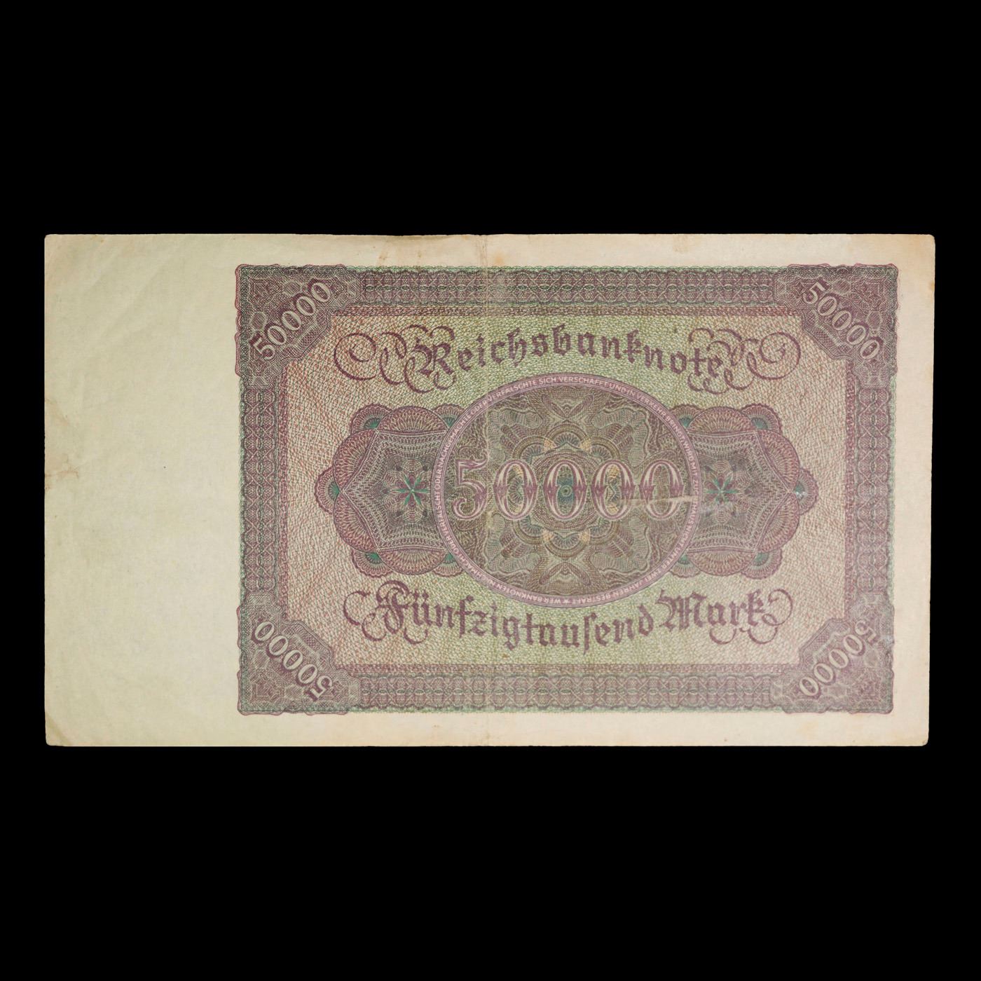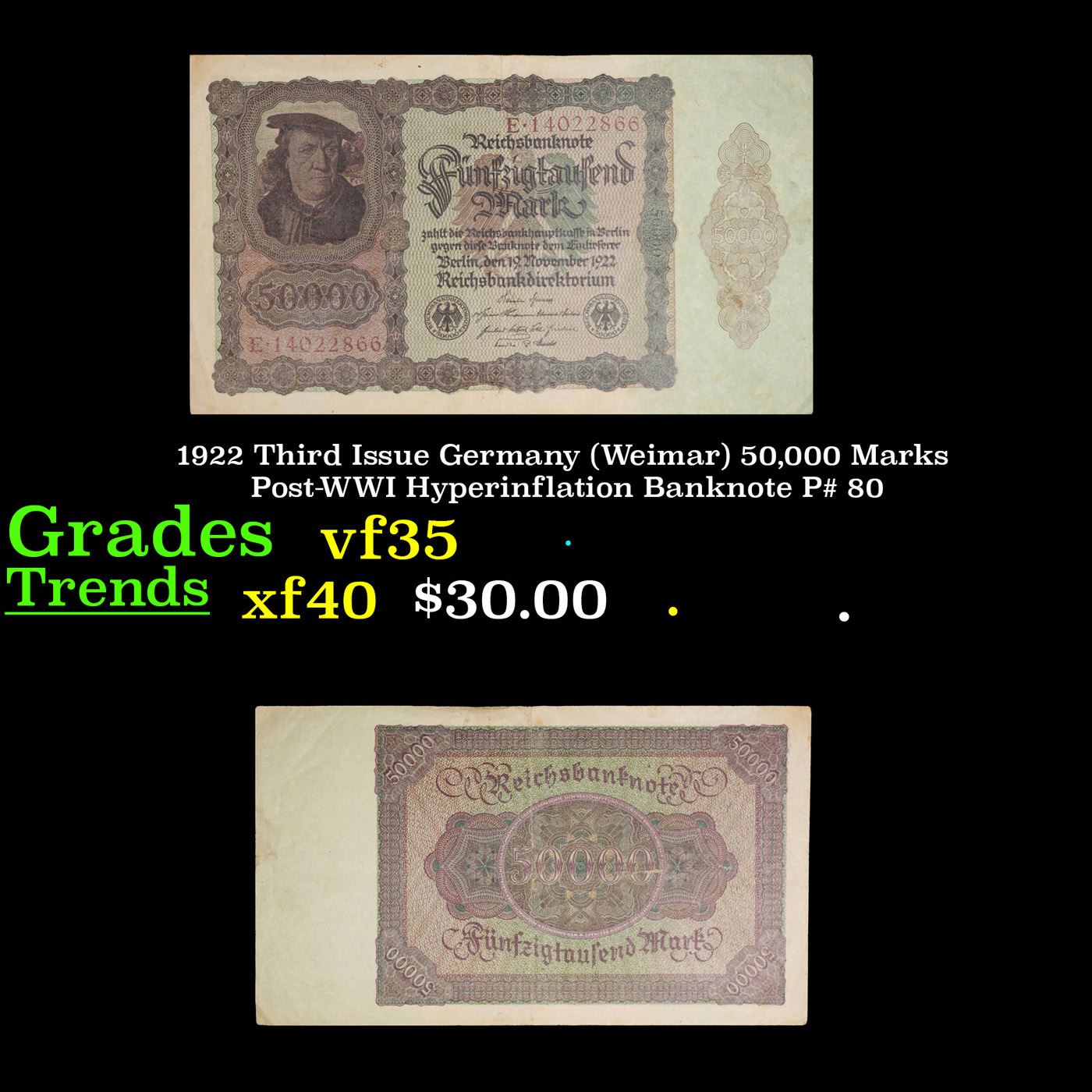 1922 Third Issue Germany (Weimar) 50,000 Marks Post-WWI Hyperinflation Banknote P# 80 Grades vf++. In the early 1920s, post-WWI Germany saw its economy spiraling out of control. Hyperinflation started directly after the war in 1918, but truly took over the Weimar Republic from 1921 to 1923. The value of the Mark declined incredibly rapidly. 1 USD was equal to 50 German Marks at the beginning of 1920. Toward the end of 1923, 1 USD was equal to over 4,200,000,000,000 German Marks. At times, denominations of the Mark became less valuable than the paper and labor to print it almost immediately after printing. Thus, denominations of the Mark notes became incredibly large, ending up in the tens of trillions.
