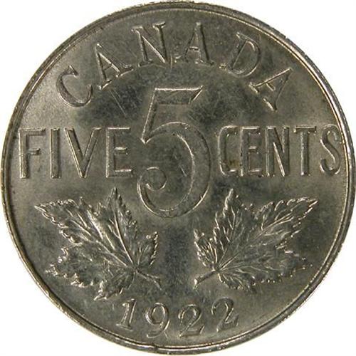 Canada Five Cents 1922, Uncirculated to Choice Uncirculated. A near fully struck piece from slightly pebbled dies